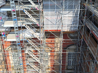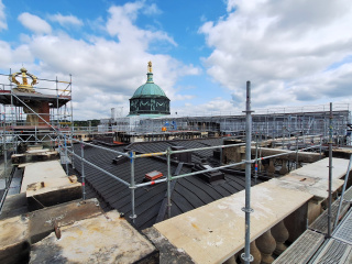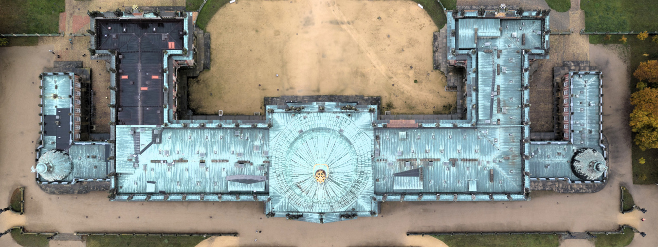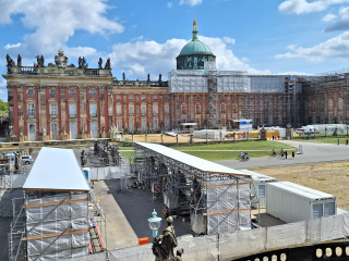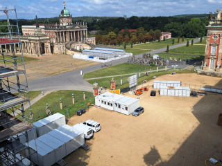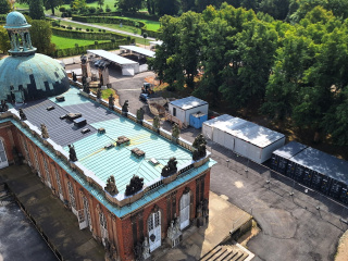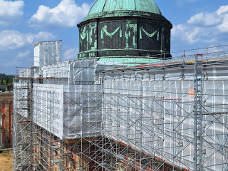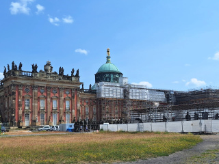 Wir sind eingestiegen: In den nächsten Jahren setzen wir die Dachsanierung am Neuen Palais in Sanssouci um. Geplant sind sechs Bauabschnitte mit umfangreichen Arbeiten am Tragwerk, der Dacheindeckung, am Naturstein, den Skulpturen sowie der Haustechnik. Das Museum im Neuen Palais bleibt während der Bauzeit geöffnet.