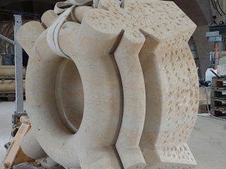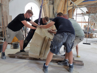 Heute hat die Mannschaft der Steinservice GmbH den Einbau des Schlusssteins geprobt. Zwar wurden die für die Errichtung der Konstruktion notwendigen Lehrgerüste noch nicht hergestellt, dennoch will der spätere Einbau des knapp eine Tonne schweren Schlusssteins geübt sein.