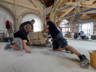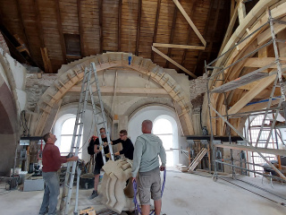 Später wird er seinen Platz finden im Zentrum des Chorgewölbes der Klosterkirche. Sobald der Stein final eingepasst ist, trägt sich das Gewölbe selbst. Anschließend kann das Lehrgerüst aus Holz zurückgebaut werden. Noch ist allerdings davon nicht viel zu sehen. Es bleibt spannend!
