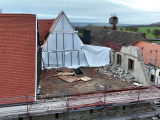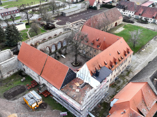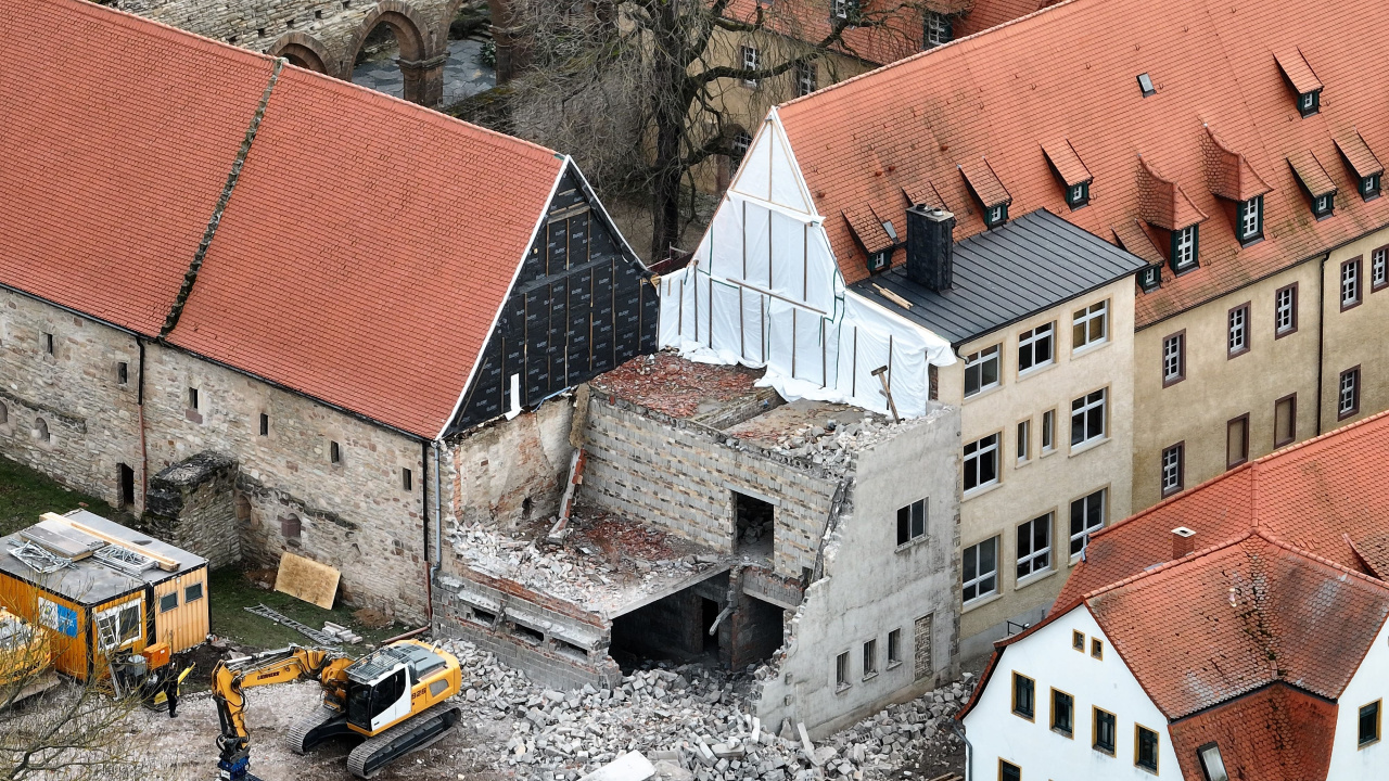 Um die im Nordflügel vorhandenen Räumlichkeiten der Museumspädagogik zu erweitern, werden wir im Kloster Memleben einen Ersatzneubau errichten. Mit diesem erschließen wir die Ausstellungsräume im Ostflügel sowie den Nordflügel auch barrierefrei. Der dafür notwendige Rückbau des an der Nord-Ost-Ecke der Klausur vorhandenen Baukörpers aus den 1970er Jahren hat im Januar begonnen. Jetzt kam der Abrissbagger zum Einsatz.