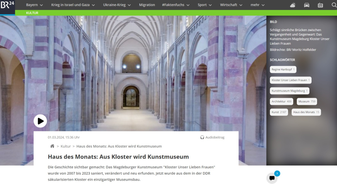Jeden ersten Samstag im Monat gibt es in BR24 das Haus des Monats – unterstützt durch die Bayerische Architektenkammer. Im März wurde das Kunstmuseum Kloster Unser Lieben Frauen in Magdeburg zum Haus des Monats gekürt.