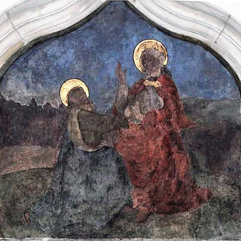 Wenden wir uns zunächst der Malerei auf Stein über dem Nordportal – der Supraporte – zu. Das obere Bildfeld zeigt eine Darstellung der "Bekehrung des ungläubigen Thomas", in den beiden unteren Bildfeldern werden die Wappen des Bistums Merseburg und der Familie von Trotha dargestellt.