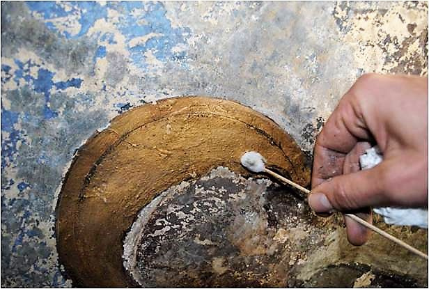 Nach Abschluss der Voruntersuchungen wurden zunächst Reinigungsproben angelegt. Aufgrund der dicken Schmutzschicht sind die Korrosionsprodukte der Kupferbleche über die Vergoldung "gewachsen", so dass auch nach dem Abstauben mit Pinseln und Bürstchen der mattgraue, eher ungepflegte Charakter weitestgehend bestehen blieb. Aus diesem Grund wurden Reinigungstests mit einem Komplexbildner durchgeführt und die Reinigung erfolgte mit in Komplexon getränkten Wattestäbchen, anschließend wurde mit Wasser nachgereinigt.