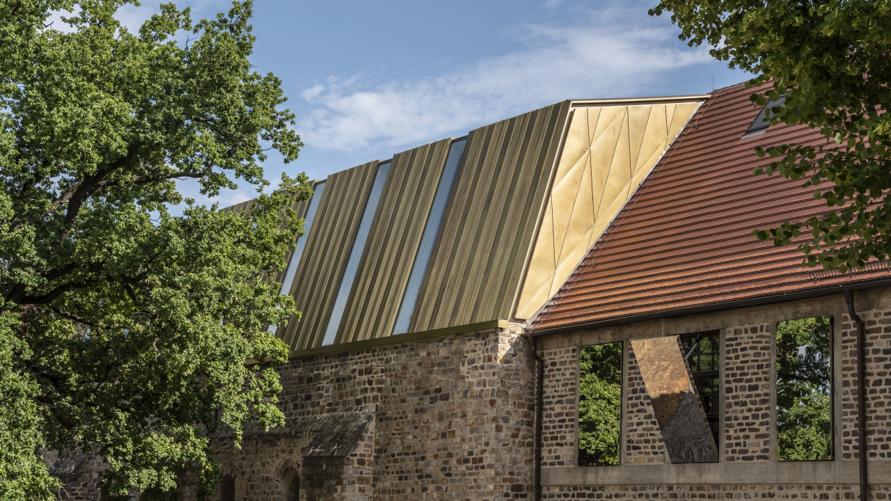 Die Dachhaut aus Baubronze ist in ihrer Form und Ausbildung einzigartig: Sie wurde gestalterisch mit Blick auf die tausendjährige Geschichte des Klosters entwickelt, markante Jahreszahlen wurden in eine besondere Faltung übersetzt. Es entstand ein individuelles Spiel aus Licht und Schatten. Mit Alterung wird das Material dunkler und sich weiter eigenständig in die Bruchsteinmauern der Umgebung einfügen.