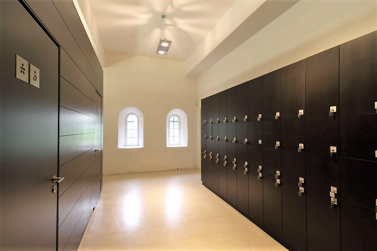 Als weiteres Angebot für Besucher konnte das Café im Erdgeschoss innerhalb der Raumgrößen des ehemaligen Refektoriums überarbeitet und neu eröffnet werden. Die großen Verglasungen zum Kreuzgang verbinden den Raum mit Kreuzhof, Tonsur und mittelalterlichen Arkaden.